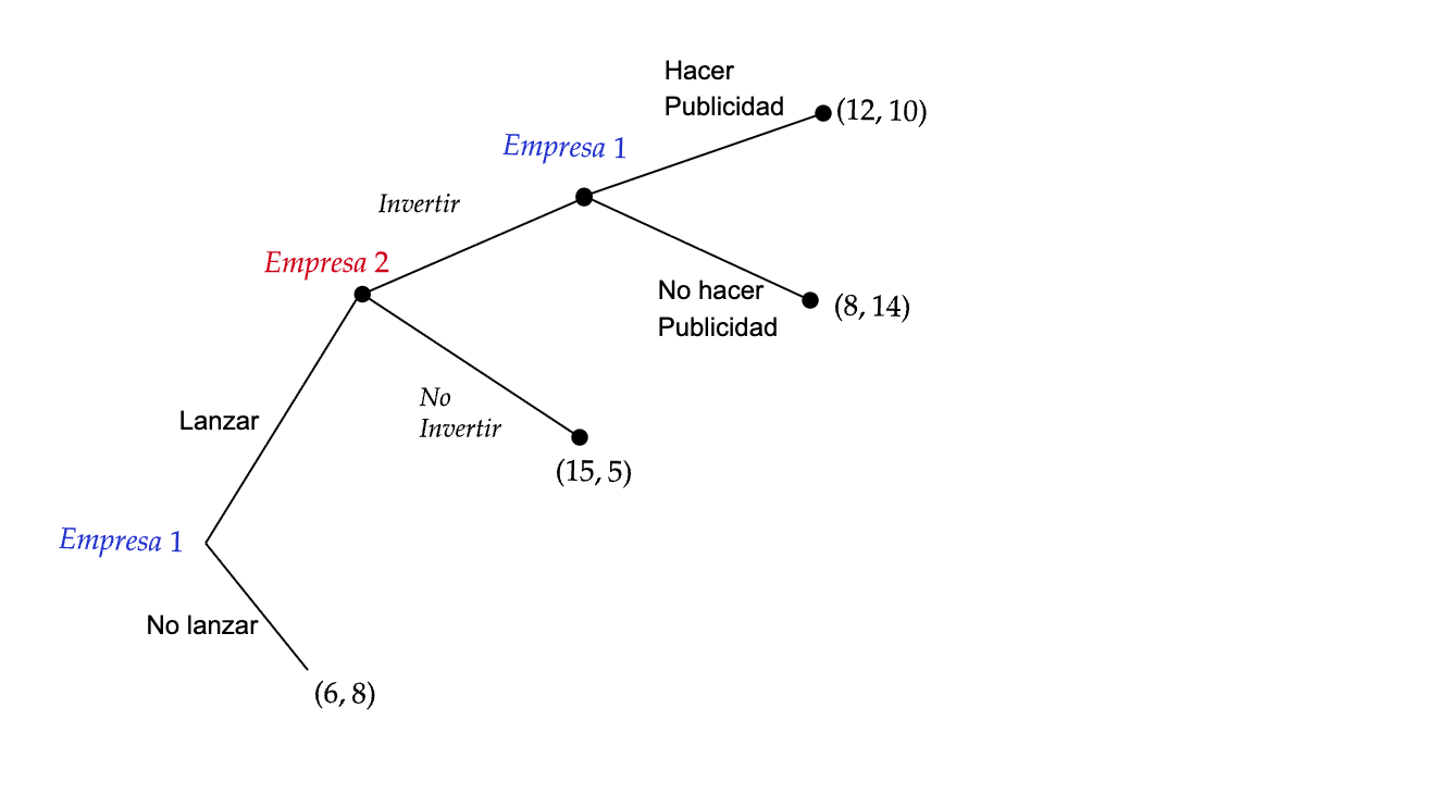 Si A lanza el nuevo producto y luego hace publicidad, y B invierte, entonces A gana 12 y B gana 10.